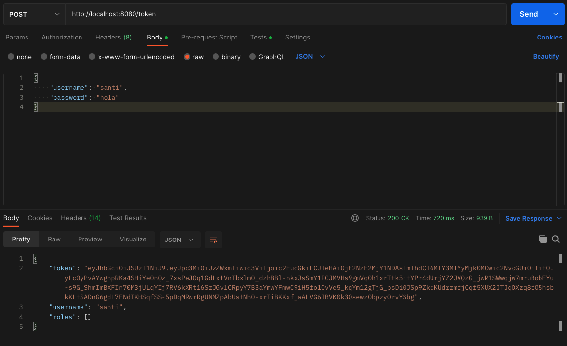 @PostMapping("/token") public ResponseEntity<?> authenticateUser(@Valid @RequestBody UserDTO userDTO) { Authentication authentication = authenticationManager.authenticate( new UsernamePasswordAuthenticationToken(userDTO.getUsername(), userDTO.getPassword())); SecurityContextHolder.getContext().setAuthentication(authentication); String jwt = jwtUtils.generateJwtToken(authentication); User userDetails = (User) authentication.getPrincipal(); List<String> roles = userDetails.getAuthorities().stream() .map(GrantedAuthority::getAuthority) .collect(Collectors.toList()); return ResponseEntity.ok(new JwtResponse(jwt, userDetails.getUsername(), roles)); }