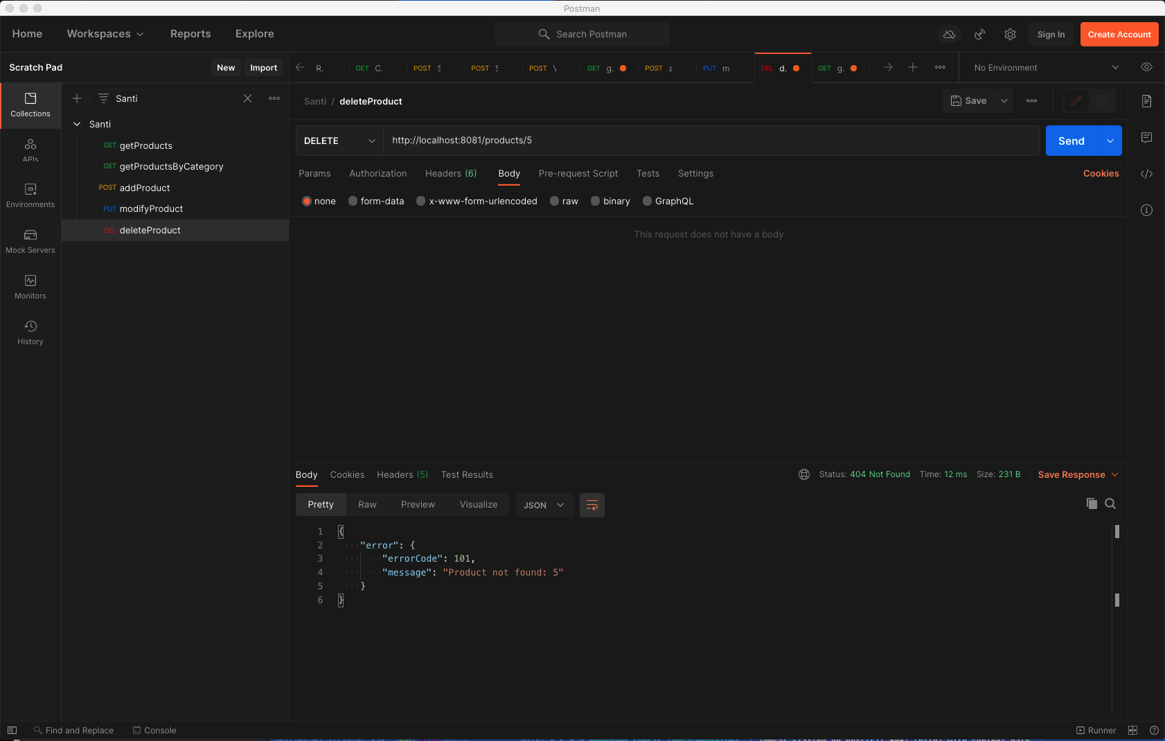 2021-03-02 21:47:55,813 ERROR [http-nio-8081-exec-2] c.s.m.c.ProductController : Product not found: 2 com.sanvalero.myshop.exception.ProductNotFoundException: Product not found: 2 at com.sanvalero.myshop.service.ProductServiceImpl.lambda$deleteProduct$1(ProductServiceImpl.java:49) at java.base/java.util.Optional.orElseThrow(Optional.java:408) at com.sanvalero.myshop.service.ProductServiceImpl.deleteProduct(ProductServiceImpl.java:49) at com.sanvalero.myshop.controller.ProductController.deleteProduct(ProductController.java:60) at java.base/jdk.internal.reflect.NativeMethodAccessorImpl.invoke0(Native Method) at java.base/jdk.internal.reflect.NativeMethodAccessorImpl.invoke(NativeMethodAccessorImpl.java:62) at java.base/jdk.internal.reflect.DelegatingMethodAccessorImpl.invoke(DelegatingMethodAccessorImpl.java:43) at java.base/java.lang.reflect.Method.invoke(Method.java:566) at org.springframework.web.method.support.InvocableHandlerMethod.doInvoke(InvocableHandlerMethod.java:197) at org.springframework.web.method.support.InvocableHandlerMethod.invokeForRequest(InvocableHandlerMethod.java:141) at org.springframework.web.servlet.mvc.method.annotation.ServletInvocableHandlerMethod.invokeAndHandle(ServletInvocableHandlerMethod.java:106) at org.springframework.web.servlet.mvc.method.annotation.RequestMappingHandlerAdapter.invokeHandlerMethod(RequestMappingHandlerAdapter.java:894) at org.springframework.web.servlet.mvc.method.annotation.RequestMappingHandlerAdapter.handleInternal(RequestMappingHandlerAdapter.java:808) at org.springframework.web.servlet.mvc.method.AbstractHandlerMethodAdapter.handle(AbstractHandlerMethodAdapter.java:87) at org.springframework.web.servlet.DispatcherServlet.doDispatch(DispatcherServlet.java:1060) at org.springframework.web.servlet.DispatcherServlet.doService(DispatcherServlet.java:962) at org.springframework.web.servlet.FrameworkServlet.processRequest(FrameworkServlet.java:1006) at org.springframework.web.servlet.FrameworkServlet.doDelete(FrameworkServlet.java:931) at javax.servlet.http.HttpServlet.service(HttpServlet.java:658) at org.springframework.web.servlet.FrameworkServlet.service(FrameworkServlet.java:883) at javax.servlet.http.HttpServlet.service(HttpServlet.java:733) . . . . . .